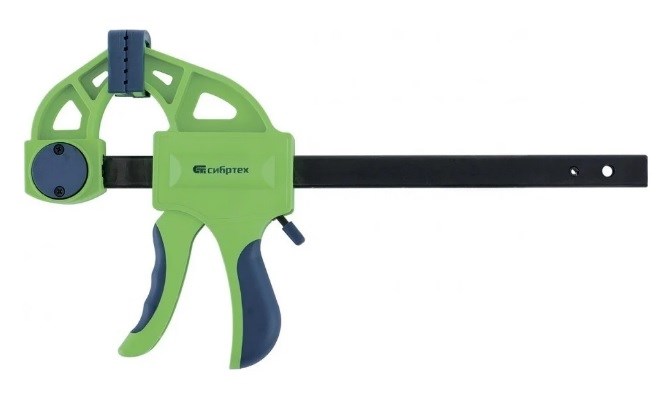 F-образная быстрозажимная струбцина СИБРТЕХ 20565 выполнена из комбинации стали и ударопрочного пластика.