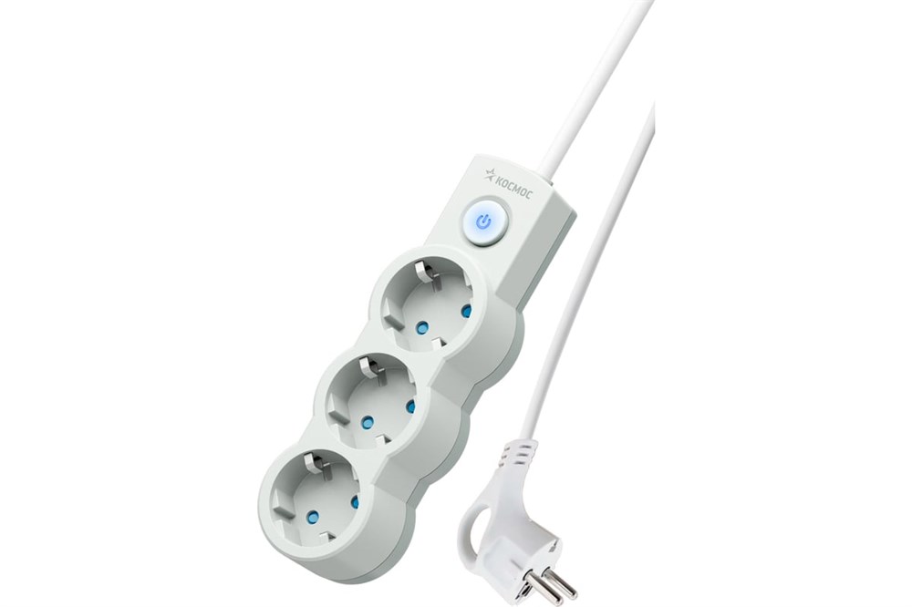 Удлинитель КОСМОС, 3х3м, ПВС 3х0.75мм2, 10А, 2200Вт, с заземлением, с защитными шторками, с выключателем, белый