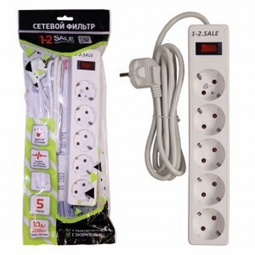 Удлинитель с сетевым фильтром 1-2.SALE 901415, 2200Вт, ПВС 3х0.75мм2, 5 розеток, 1.8м, с заземлением, выключатель на корпусе, белый