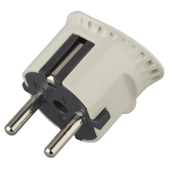 Электрическая вилка, изготовленная из пластика, устойчивого к царапинам и оплавлению.