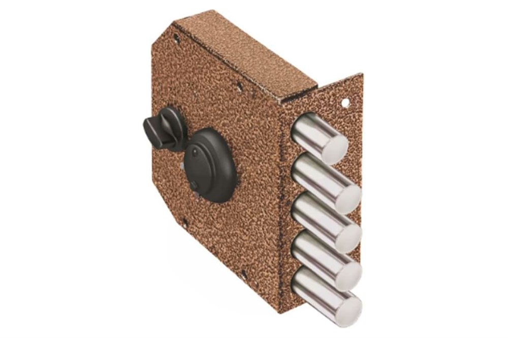 Замок накладной сувальдный с задвижкой. Предназначен для установки на металлические двери. Замок имеет засов из четырех цилиндрических ригелей диаметром 18 мм, с максимальным вылетом 40 мм, и задвижку диаметром 18 мм с вылетом 26 мм. Удаление ключевого отверстия - 64 мм. Количество оборотов ключа - 4.