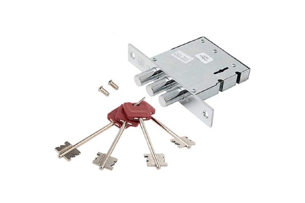 Замок врезной сувальдный с тремя ригелями. Предназначен для установки во входные и технические металлические двери. Количество сувальд – 6 шт. Бэксет – 60 мм. Вылет ригелей – 26 мм. Диаметр ригелей – 14 мм. Открывание – 2 полуоборота. Четыре ключа с пластиковой головкой. Длина шейки ключа 60 мм.
