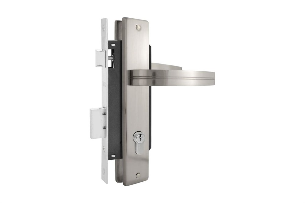 Врезной замок в сборе универсальный, может быть установлен на двери левого и правого типа открывания. Имеет цилиндровый механизм запирания длиной 60 мм с модификацией «ключ-ключ». Межосевое расстояние 85 мм. Изготовлен стали и закаленной стали. Ручки на планке врезного замка для двери выполнены из сплава алюминия и стали. Механизм в ручках - пружина из закаленной стали с повышенным ресурсом работы. Корпус врезного замка в дверь покрыт антикоррозийным составом, а лицевая планка корпуса и ручки имеют многослойное гальваническое покрытие, которое защищает от механических повреждений.