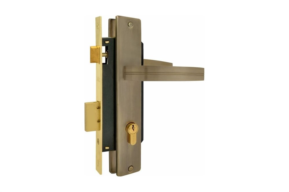 Врезной замок в сборе универсальный, может быть установлен на двери левого и правого типа открывания. Имеет цилиндровый механизм запирания длиной 60 мм с модификацией «ключ-ключ». Межосевое расстояние 85 мм. Изготовлен стали и закаленной стали. Ручки на планке врезного замка для двери выполнены из сплава алюминия и стали. Механизм в ручках - пружина из закаленной стали с повышенным ресурсом работы. Корпус врезного замка в дверь покрыт антикоррозийным составом, а лицевая планка корпуса и ручки имеют многослойное гальваническое покрытие, которое защищает от механических повреждений.