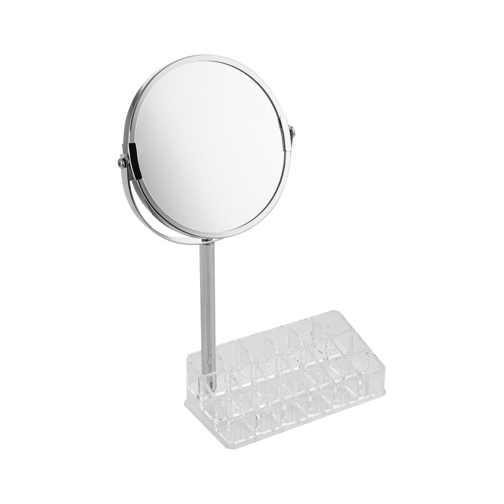 Зеркало настольное, косметическое, с подставкой для макияжных принадлежностей, двустороннее, с увеличительным эффектом. Изготовлено из прочной нержавеющей стали с хромированным покрытием, которое придает безупречный стильный вид и долговечность. Хромированное покрытие очень стойко переносит истирания и обеспечивает зеркальный блеск изделия. Установлено на металлический хромированный держатель, позволяющий поворачиваться вокруг своей оси и регулировать угол наклона модели. Одна из сторон зеркала имеет 2 х-кратное увеличение удобное для косметических процедур, нанесения макияжа и бритья. Устанавливается на любую поверхность.